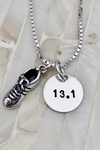 Runner’s charm necklace personalized with initial or distance of race- running gift to commemorate a marathon, half marathon, 5k, 10k and more! Optional running girl or tennis shoe charm may be added. Sterling silver, hand...