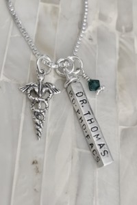 Caduceus charm necklace personalized with doctor’s name, school, hospital, graduation date- medical team appreciation gift, graduation gift and more! Sterling silver, hand stamped necklace. Four-sided name bar measures 25mm. Caduceus Medical Symbol Charm. Optional Swarovski crystal...