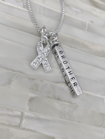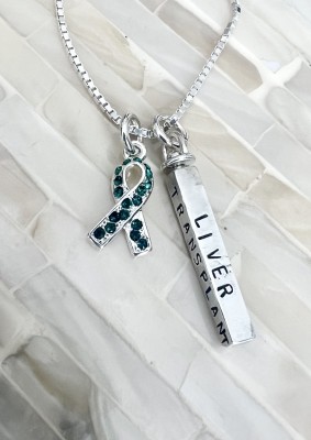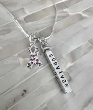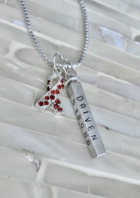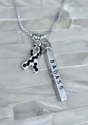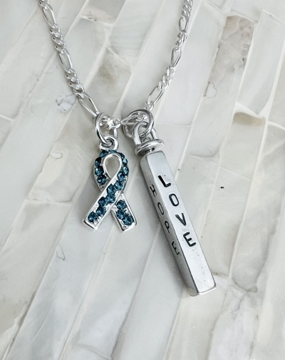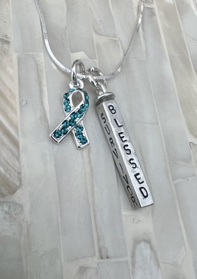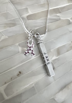 Personalized awareness ribbon necklace hand stamped with name, date and inspirational words. Wear on your journey to fight cancer or customize a survivor or remission gift for someone to raise awareness for their special cause.