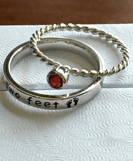 Our family just grew by two baby feet stacking ring- a sweet baby gift or push present for a new mom to celebrate her bundle of joy. Optional birthstone ring to make it extra personal.