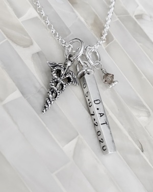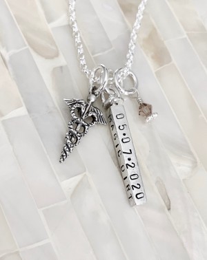 Personalized caduceus charm necklace- perfect graduation gift for a RN, medical professional or nurse. Customize with a name, graduation date or message.