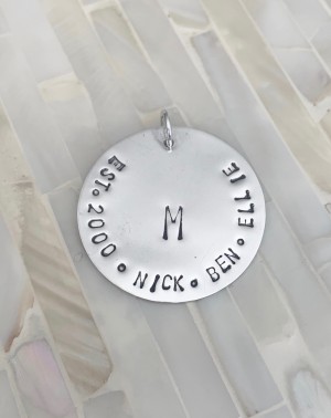 Sterling silver circle charm personalized with family names, date and initial of last name- a perfect mothers necklace to wear her kids names close to heart.
