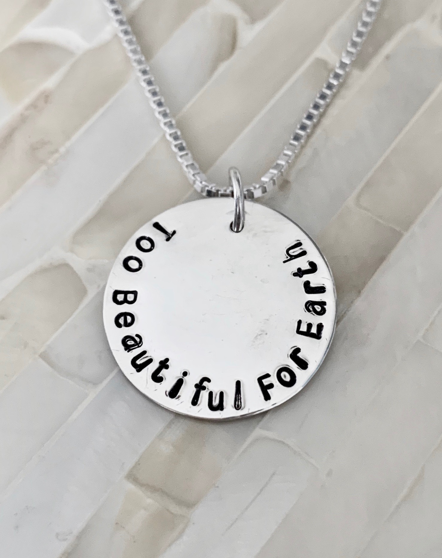 Personalized memorial necklace with ‘too beautiful for earth’ or custom phrase- remembrance gift to honor the loss of a loved one and keep close to your heart.