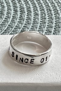 The sterling silver, hand stamped ring measures 6mm and is personalized with a custom message up to 30 characters.